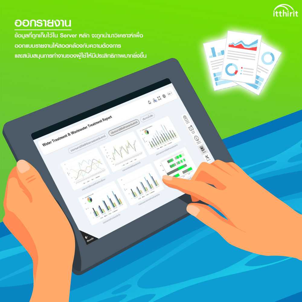System exampleThe wastewater management system operates by sending all data to a data storage server, which can be either an internal server or a cloud-based server. On the system's interface, it displays the operational status and summarized information, such as the total water flow, pump and motor statuses. It also provides alerts in case of abnormal pump or motor operation. Itthirit Technology Co., Ltd. provides an all-encompassing service for the government's wastewater management. The system monitors water levels, pump statuses, and other environmental conditions, ensuring water quality throughout the station. Data is transmitted via the 3G network to a Cloud Server for analysis and display, allowing real-time tracking and comprehensive reporting. In case of errors, the system will display alert messages on the main screen for notifications. Additionally, immediate notifications can be sent through the LINE application on mobile devices. The system connects WAGO PLC devices to wastewater treatment stations at various locations. The data is then transmitted to the main server for further analysis. The system provides real-time status and various information. Users can remotely control the operations from mobile devices. The data stored in the main server is analyzed to design reports tailored to meet specific requirements, supporting users to enhance their efficiency and productivity.